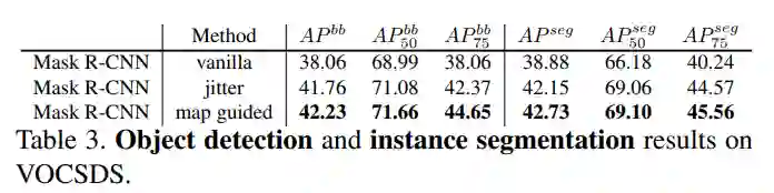研究人员还使用 Mask R-CNN 在 VOCSDS 数据集上进行实验,目标检测和实例分割提升分别是 4.2mAP 和 3.9mAP,仍旧十分可观。