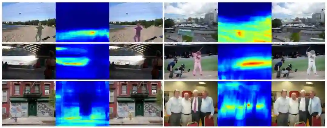 其中 M=max(d(D, D0)),m=min(d(D, D0))。通过将 h(•) 映射到背景图片上的每一个像素,即可获得一个热度图。通过热度与概率之间的映射,可以使用蒙特卡洛方法进行采样,得到高外观一致性的粘贴位置。下图为几则热度图与增强后的实例。