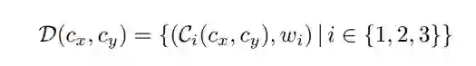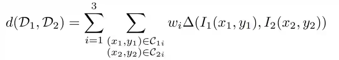 外观距离定义为,外观描述符之间局部外观一致性的度量。由于我们已经定义了具有三个轮廓区域和相应权重关联描述符,D1=D(c1x, c1y) 和 D2=D(c2x, c2y) 之间的外观距离被定义为: