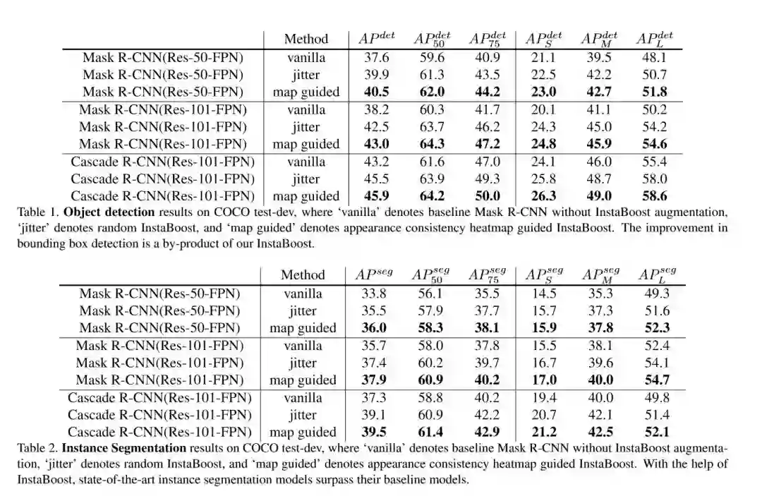研究者在这篇论文中提出了两种递进的实例层面的数据增强算法:Random InstaBoost 和 Map-guided InstaBoost。这类算法极大地提高了检测和分割精度。