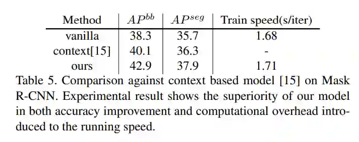 从速度上来看,InstaBoost 可以作为在线算法嵌入到 dataloader 内部,在 Mask R-CNN 上对比,使用前后每轮迭代仅增加了 0.03s 的时间成本。而使用 context model 的算法,需要对特定数据集预先进行训练等操作,花费大量额外时间,并且难以作为在线算法内嵌到代码框架内。