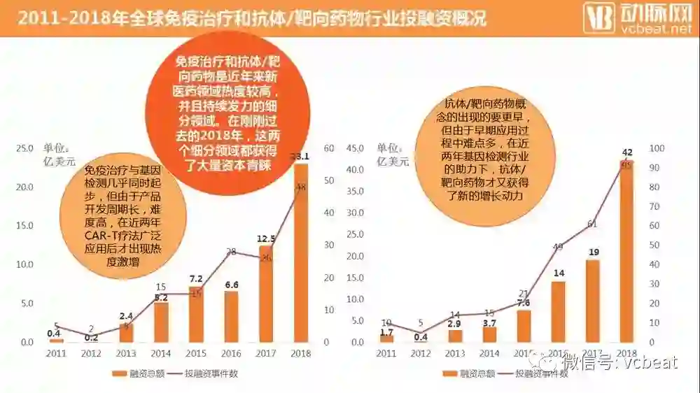 根据动脉网的数据统计,在企业投融资数据方面,免疫治疗和抗体/靶向药物两个领域的企业融资在近几年大幅度上升。二者在过去几年的发展中都走出了标准的指数增长曲线。尤其是在2018年,免疫治疗行业融资总额增长84.8%,抗体/靶向药物则是121.1%。二者都是近几年新医药领域的焦点内容。