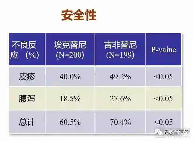 令人兴奋的是,最后的开盲结果显示,埃克替尼具有很好的临床效果,二、三线治疗晚期非小细胞肺癌患者疗效和吉非替尼相当,不良反应更少。