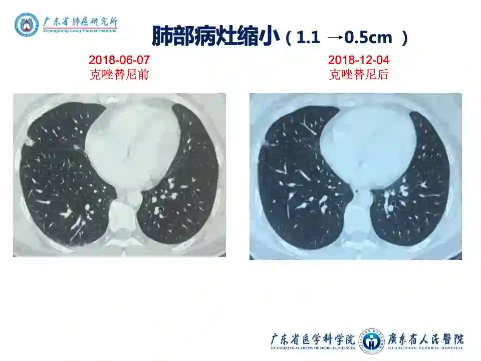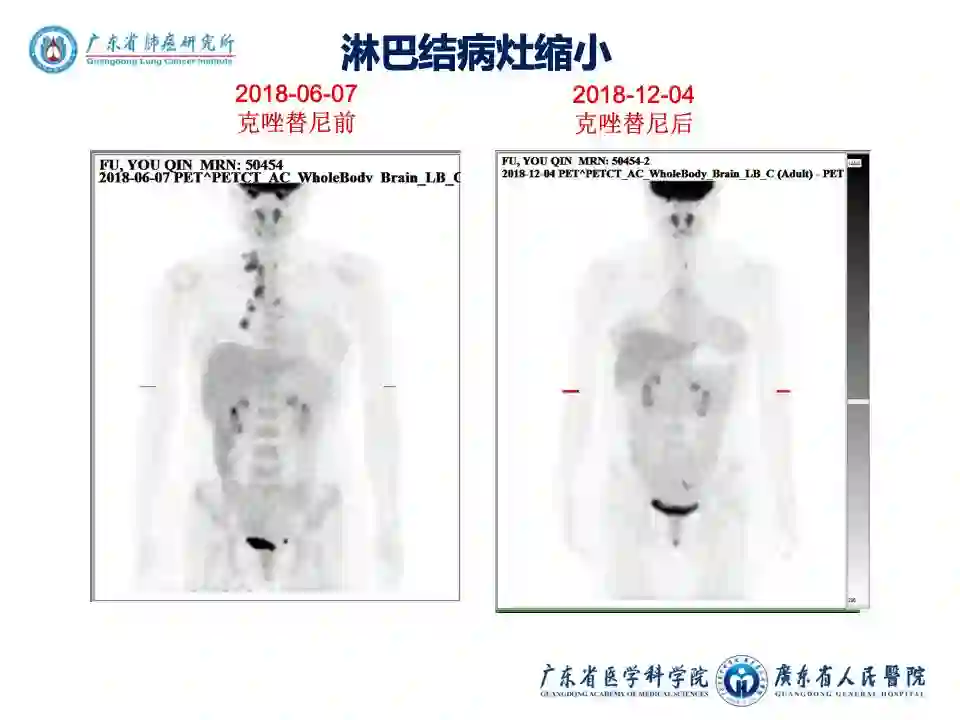 4)患者于2018-7-6,开始服用克唑替尼 ,2018-12-04 PET/CT与2018-06-07本院PET/CT比较:仅存在右肺中叶0.5cm结节及右肺门1*0.9cm淋巴结