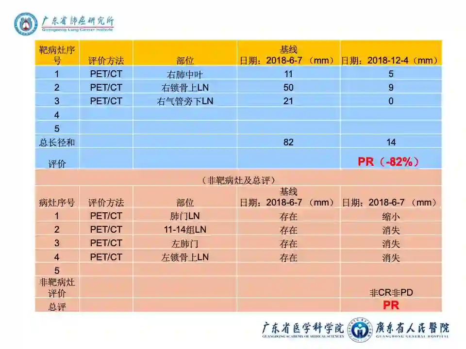 8)2018-12-04 PET/CT与2018-06-07本院PET/CT比较:原肺部病灶及淋巴结较前明显缩小,糖代谢较前明显降低。