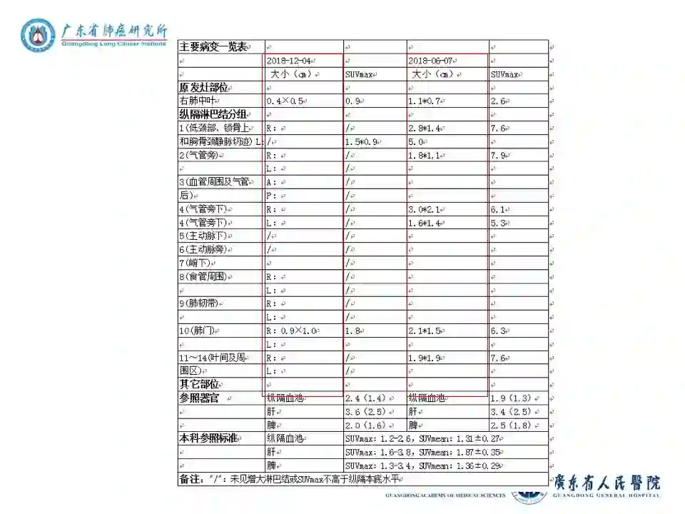 6)我院2018-06-07复查PET/CT:右肺中叶1.1*0.7cm,SUVmax2.6,1组、2组、4组、10组、11-14组等区域淋巴结多发转移。当时放疗科会诊:考虑双侧锁骨上淋巴结均肿大,纵膈淋巴结多发转移,放疗范围较大,暂不考虑根治性放疗。