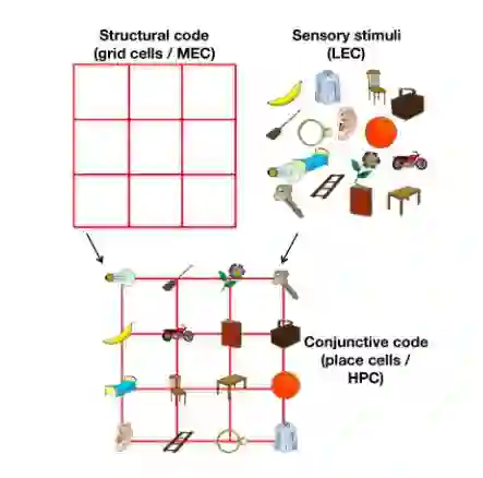 这里我们提出了一个由海马 - 内嗅系统启发的结构泛化机制。我们提出可以通过结构和刺激的明确分离来概括状态空间统计,同时使用连接记忆表示来连接两者。我们提出使用空间层次来允许有效的组合代码。我们已经表明,在纯粹无监督的学习环境中,层次网格状和地点状表示自然地从我们的模型中出现。我们已经表明这些表示对于状态空间的概括是有效的,但对于分层存储器寻址也是有效的。我们还提供了实验证据,证明网格和地点单元在环境中保持其关系,这支持了我们的模型假设