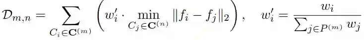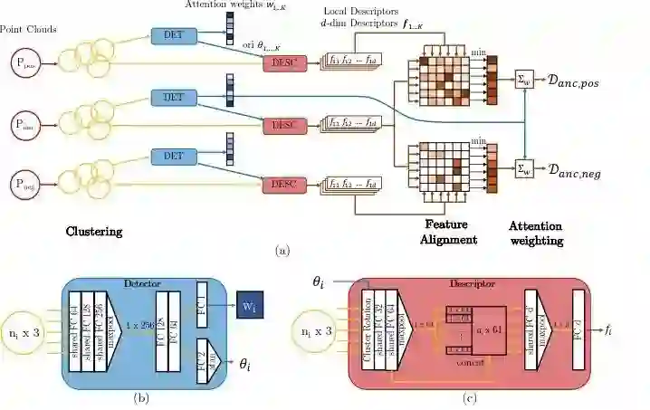 上图展示了3DFeat-Net的三分支siamese网络系统结构。每个分支将整个点云P作为输入。对于每个集群Ci,一个方向θi和注意力wi由检测器网络预测,如图(b)所示。然后,描述子网络使用预测的方向θi将Ci旋转到规范的结构,并计算描述子fi如图(c)所示。使用对齐目标来比较各个描述子fi,具体而言,两个点云P(m)和P(n)之间的所有描述符对之间的距离由下式给出:
