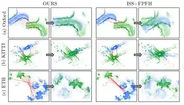 作者在几何配准问题上通过Oxford RobotCar,KITTI odometry,KITTI,ETH数据集测试了提出的关键点检测和描述算法。 对计算出的关键点和描述子执行最近邻匹配,并在这些最近邻匹配上使用RANSAC估计两个点云之间的刚性变换。文中定性配准结果如下图所示,使用文中的方法(左)和ISS + FPFH(右)仅显示在RANSAC之后保留的随机匹配子集,并且为了清楚起见在(c)中排除了地面。