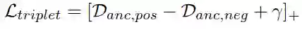 在这个公式下,来自第一点云的每个描述子与第二点中最接近的描述子对齐。 直观地,在匹配点云对中,第一点云中的集群应该在第二点云中具有类似的集群。 对于非匹配对,上述距离简单地将描述子与最类似于其自身的描述子对齐,即最难对应的描述子。模型可以随机采样负点云。每个训练元组{P(anc),P(pos),P(neg)}制定三元组损失,如下: