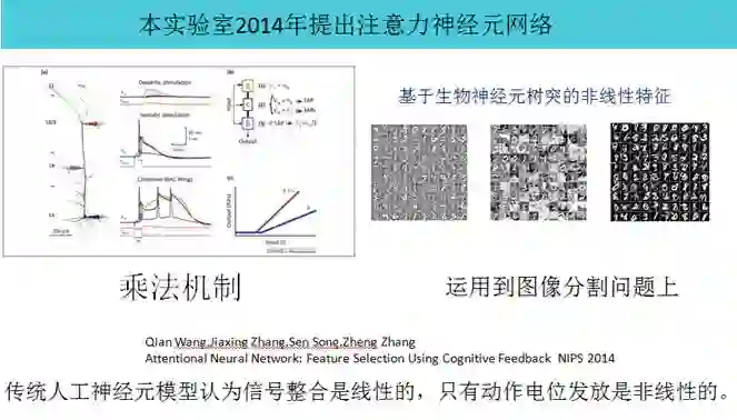 我回到清华以后, 2014年跟微软研究院的张铮老师合作,提出了一个叫注意力的神经网络。总的来说,是受神经科学的启发,我们认为以前的神经元模型太简单了。神经元可以看到它有两种因素,它会把两种因素乘起来,现在叫注意力机制,目前这类算法在深度学习里面得到了广泛应用。