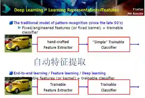 这几年机器学习的主要的区别是什么?传统上做机器学习,是先要用人工去提取一些特征,然后通常会训练一个比较简单的分类器。这几年的区别就是开始能够做自动特征提取。