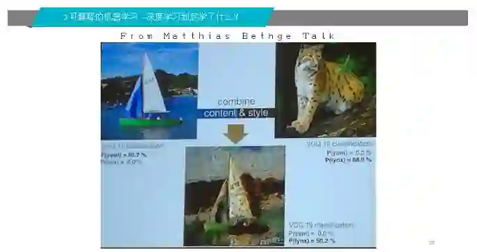 上图是很有名的例子,用深度学习的方法,将左图与右图组合起来,用右边的风格画左边这张画。然后问你,这是什么?我相信有人可能会说这是一个帆船,绝对不会说这是一个豹子,但是神经元网络说这是豹子,认为是船的概率为零。为什么?现在的卷积网络,他其实更关心概率分布,更关心纹路。