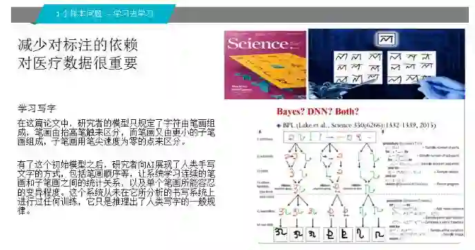 减少对标注的依赖对医疗影像很重要。前年发表在science,是怎么回事呢?通俗的讲:你能不能先学会一个概念,比如说怎么写字。不是给你一大堆东西,你就照着弄,而是你先学会写字这个概念。你学会了以后,给你看一个样子,它马上就学会了。我们在医疗影像上由于数据量比较小,以后真能用的可能是类似这样的:比如说你先学会了怎么看片,到了一个医院以后,给你看几个例子,大概这一类就学会了,这样比较现实。