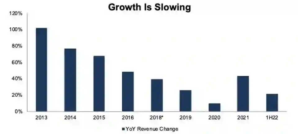 数据显示,在 2017 年,英特尔收购之前,Mobileye 的收入增长率已经在下降了,此后,收入增长持续放缓。如下图显示,Mobileye 的同比 (YoY) 收入增长从 2013 年的 102% 下降到 2022 年上半年(1H22 )的 21%。Mobileye 的同比变化为 21%,低于 2019 年大流行前 26% 的水平。