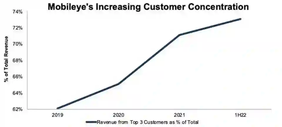 而且,Mobileye 的业务越来越集中于少数客户。如下图所示,Mobileye 的前三大客户占 Mobileye 1H22 收入的 73%,高于 2019 年的 62%。