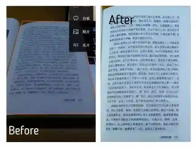打开 Office Lens,将镜头对准需要扫描的文件,在软件提供的四种扫描方式(即名片、照片、文件、白板)中选择相对应的扫描方式,随后无需任何手动操作,Office Lens 就会利用计算机视觉自动框选文件有效范围,自动雾化无用的背景进行内容截取。照片拍摄完毕之后,还可手动进行修正和转存为 Word 文档。整个过程十分高效便捷。