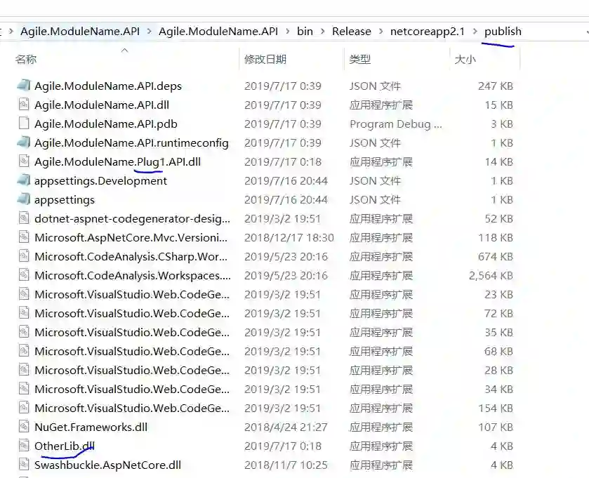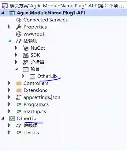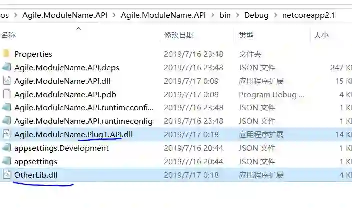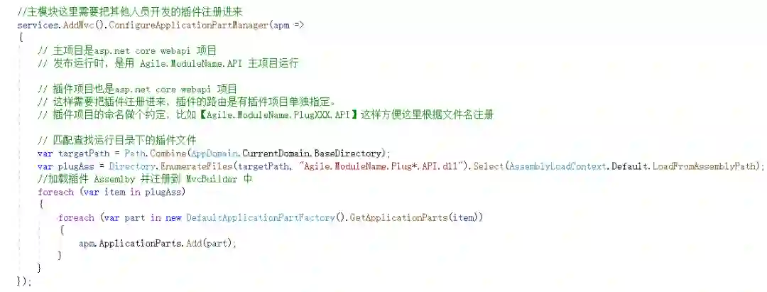 每个独立开发的都是vs里面建立的标准ASP.NET Core WebAPI项目,这里主项目和各个插件项目没有从属关系,完全平等API项目开发,最后只是可以汇合到主项目作为一个站点发布交付。各自独立调试运行各自开发功能模块,测试没问题发布汇总到主项目,部署运行,之后哪个接口问题只需要找到对应的模块修改,完全隔离开,不用担心修改会影响其他正常使用的模块。