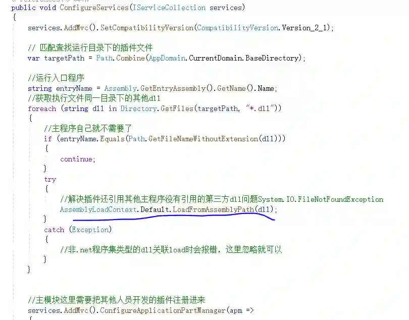 汗,居然报错了,提示FileNotFoundException,但是看上面的错误信息截图提示找不到OtherLib.dll文件。OtherLib.dll这个文件明明在这个目录有的。查了相关资料都说是.net core的加载机制变了,但还是没理解透彻,不知道.net core3.0会不会解决这个问题。希望有大神看到可以解惑下这个问题。不过这里我使用一种方式可以解决这个报错,在主程序这里加这段代码。在注册插件项目之前,遍历所有dll,做一次加载就可以了。如图20