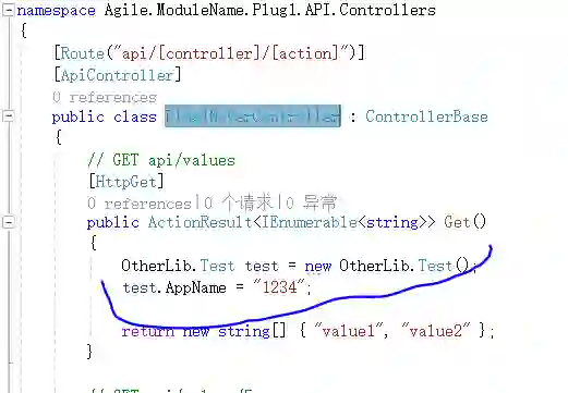 引用一个测试类库,在Plug1NoVerController的Get方法里面写一个测试代码,如图16