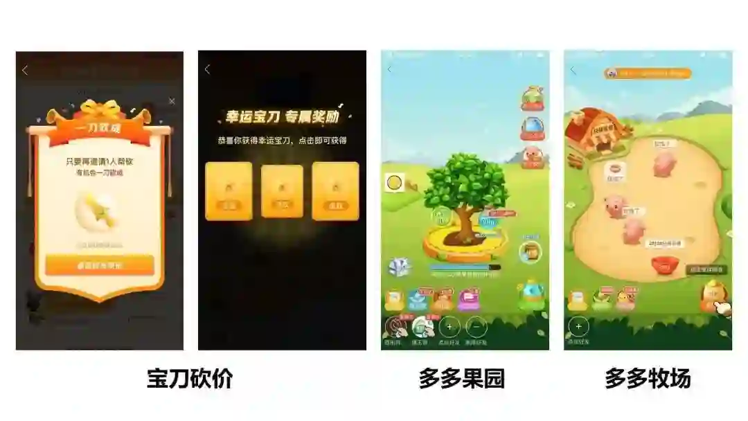 比如拼多多中融入了很多游戏化设计的元素,小到砍价中的暴击、宝刀道具,大到多多果园、多多农场这些养成类的游戏。