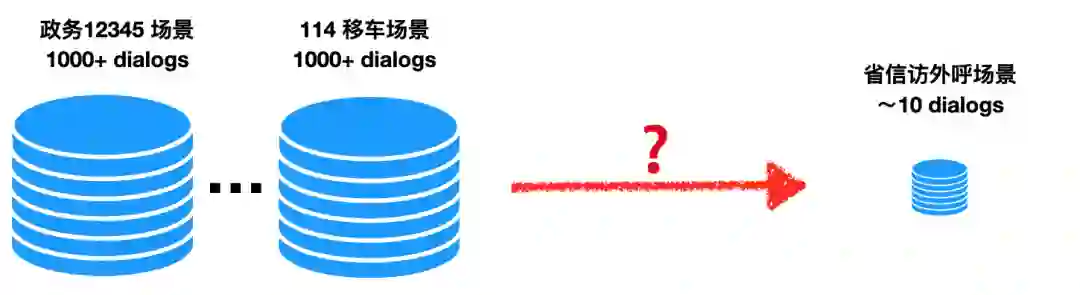 ① 数据量少:端到端模型一般需要大量的训练数据,且场景越复杂,需求越大。在 Dialog Studio 中的ToB 的业务,不少新场景一开始是没有可用的高质量对话日志,比如我们在政务12345 场景 和 114 移车场景上积累了大量的对话,可当我们做省信访外呼场景时,一开始只有极少的对话可以使用。因此如何利用已有场景的丰富数据训练好一个端到端模型,使其可以快速迁移到缺少数据的新场景上是一个很大的挑战。
