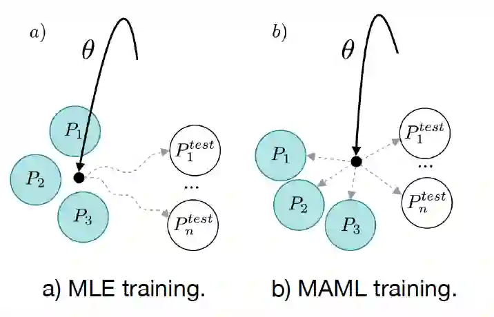MAML 是元学习中的一类方法,它具备模型普适性,通过在meta tasks上进行预训练,能够帮助模型找到一组最合适的参数,使其快速适应新任务。例如下图[9]给出了一个 MAML 和MLE 训练对比示意图,每个圆圈都是看做一个场景,实心的是训练用的源场景,空心的是测试用的目标场景,使用 MLE 预训练会导致模型的参数过拟合到源场景上,而MAML预训练则能够找到更好的参数初始化,使得快速迁移到新场景上去:
