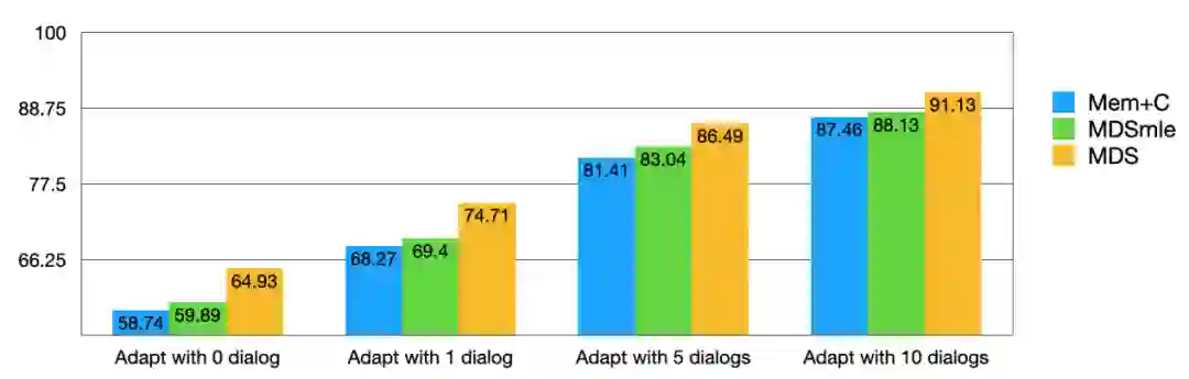 学术数据集我们选择了extended-bAbI,它是 bAbI 数据集的扩展版,包含了场景有餐馆、机票、酒店、电影、音乐、旅游、天气等 7 个场景,每个场景的训练集/开发集/测试集为 1500/500/1000 个完整对话,评价指标是回复选择的准确率。我们将 MDS、MDSmle(将MAML优化改成 MLE 优化)、Mem+C [1] 这三个模型进行对比如下: