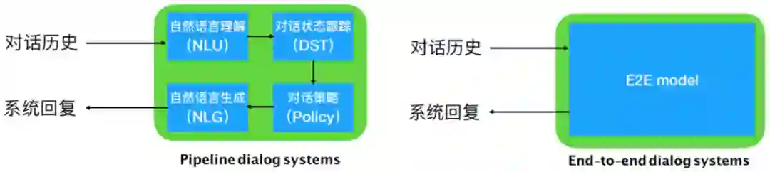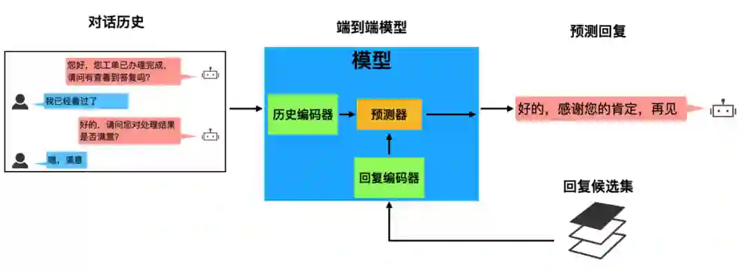 一般来说,端到端对话模型可分为检索式和生成式,检索式模型就是给定对话历史从预定义回复候选集合中选出最佳回复作为当前系统输出,生成式模型则是给定对话历史直接生成回复。两种方式都可以通过和用户多轮交互完成最终的对话任务。