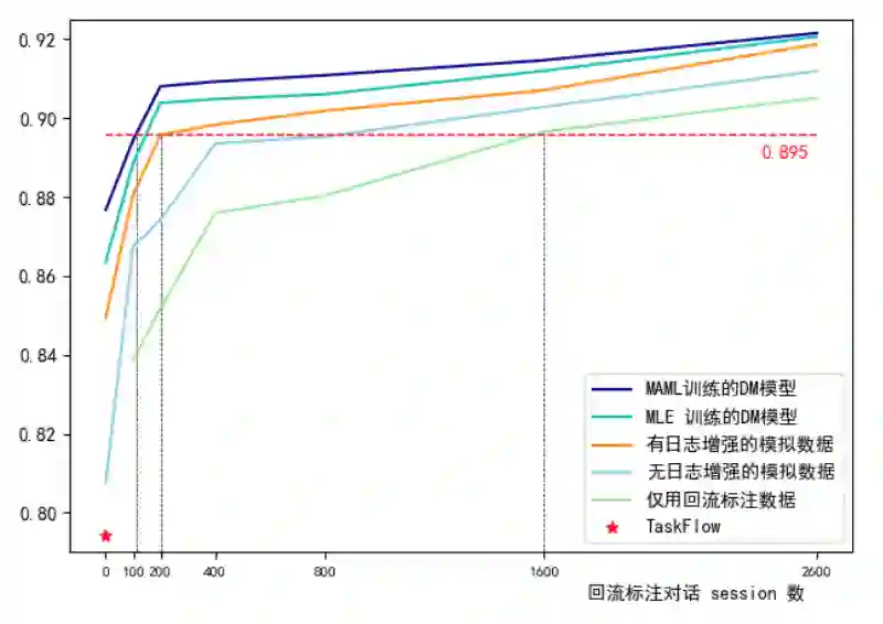 横轴是adaptation时使用的标注对话数据量,纵轴是回复准确率。可以看到,如果直接使用 TaskFlow,整个对话系统的准确率仅在 79% 左右。但是用上MDS 模型进行数据迁移和MAML 优化之后,我们可以得到最上面那条曲线,冷启动效果从 79% 提升至88% 左右,并在不同 adaptation对话数据下都能有着持续最好的表现。