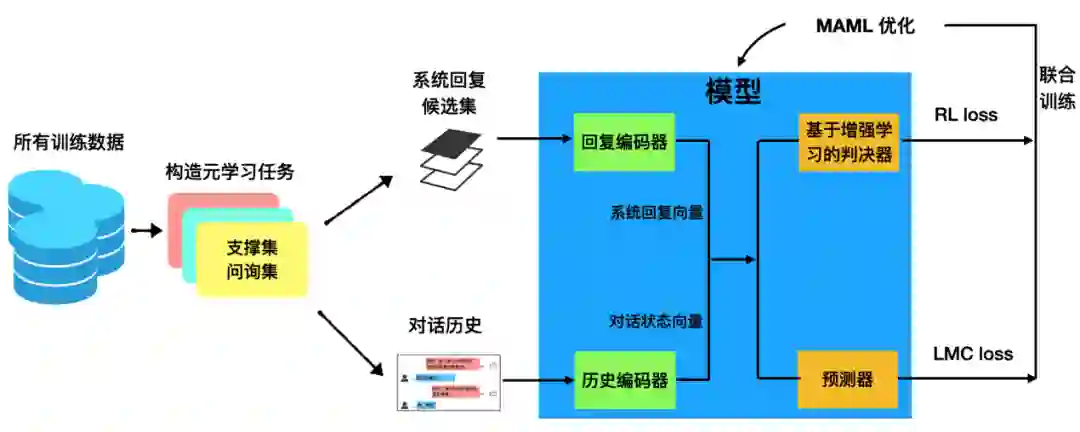 在ACL2020论文中,为了和文献 [1, 4] 一致,对于历史编码器我们仍然采用经典的 MemN2N 模型,对于回复编码器我们使用了一个简单的词向量相加的句向量。模型预测器的部分,我们选择了能够学习出更有鉴别性的特征的large margin cosine loss [7] 作为损失函数 Llmc 。针对请求人工的判决器,我们提出通过计算判决器预测的正负样本的 F1 score作为 reward 函数,使用增强学习来进行优化 Lrl 。最终,我们利用MAML对 Llmc+Lrl 进行联合优化。
