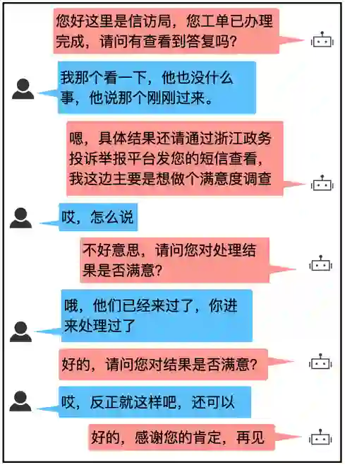 常见的智能对话系统有:问答型、聊天型、任务型等。其中任务型对话在实际应用中,尤其是在我们的ToB 场景最为普遍。因为该系统不仅可以回答用户问题,同时还能主动发问,引导会话的有效进行,通过多轮对话完成某个特定的任务。例如在一个浙江省信访的外呼场景中,一个典型的对话如下: