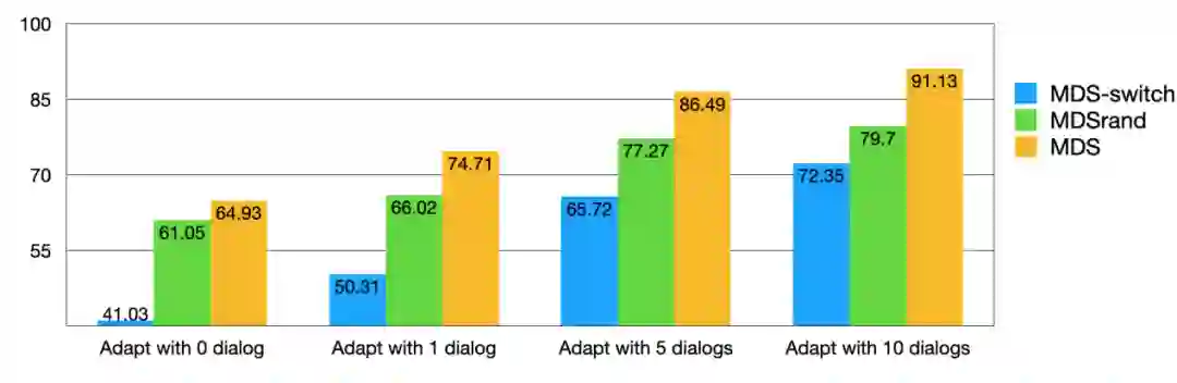 平均在新场景中,使用 0, 1, 5, 10 组完整对话 session 数据上,MDS 模型的表现都是最好的。证明了我们小样本下端到端模型的效果。同时我们也做了一下 ablation study,发现去掉判决器 (MDS-switch) 和随机转人工 (MDSrand) 的模型都很差,证明了我们的转人工判决器真的能够在联合优化中学出识别 out-of-script 的对话数据的能力,提升模型的鲁棒性。