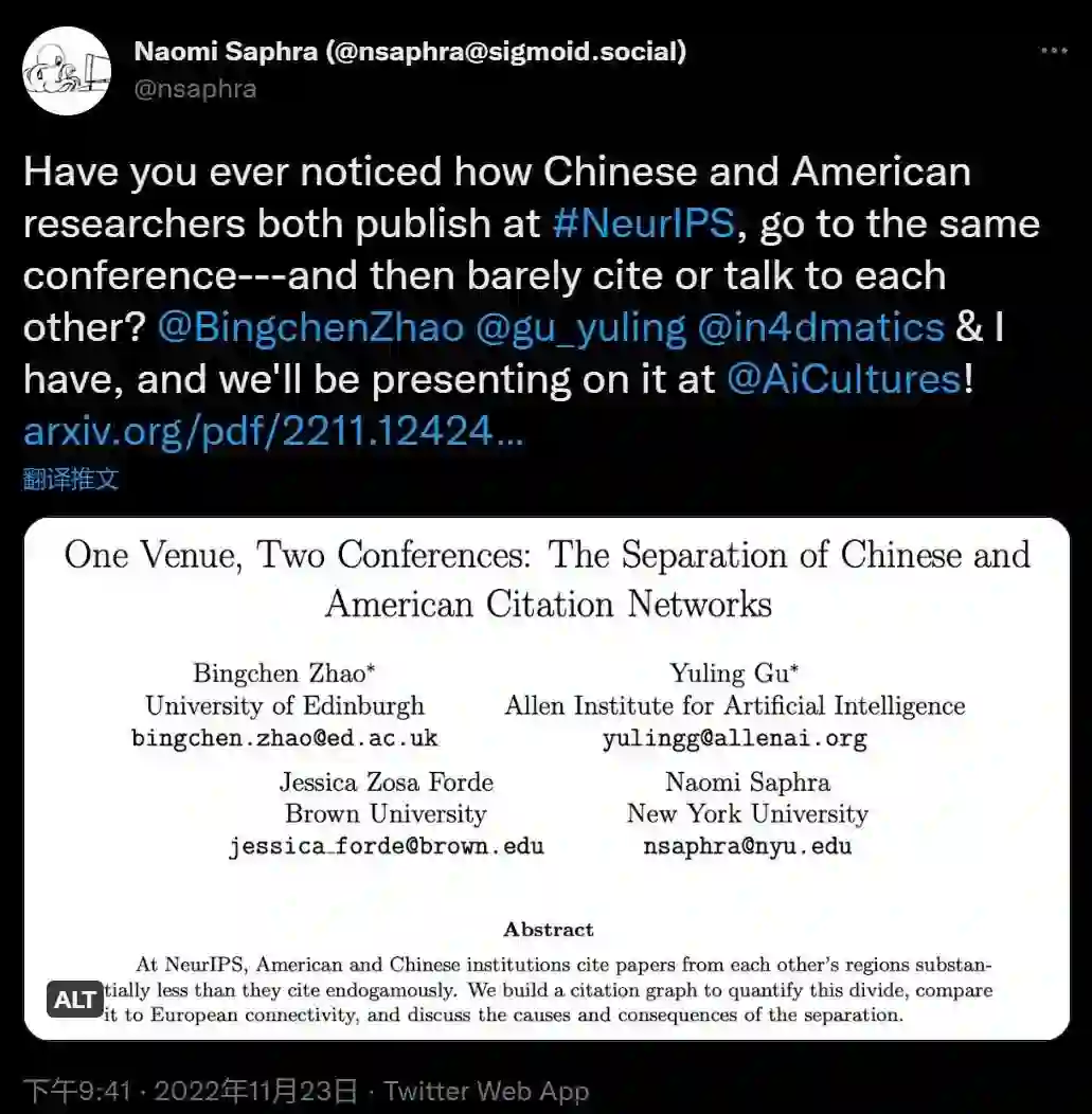说前两名缺乏学术上的交流,属实有点反直觉了。然而这份研究的统计数据已经列好,而且还要在几天后的 NeurIPS 2022 上开一个研讨会。