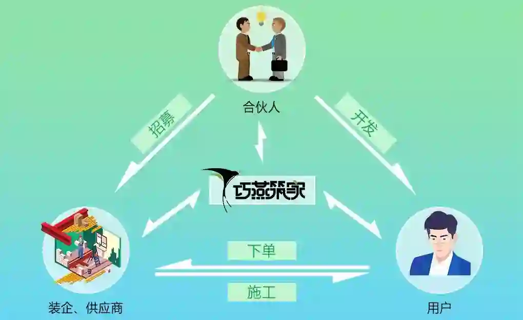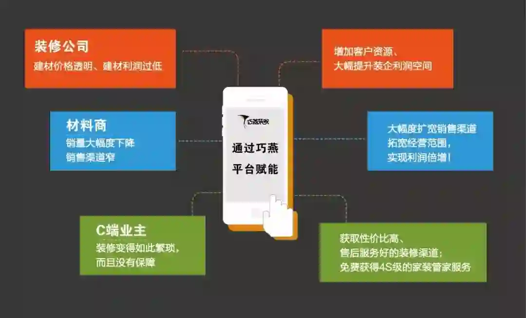 巧燕筑家平台相当于滴滴总部,用户有装修设计及购买材料需求就向装企供应链派单;