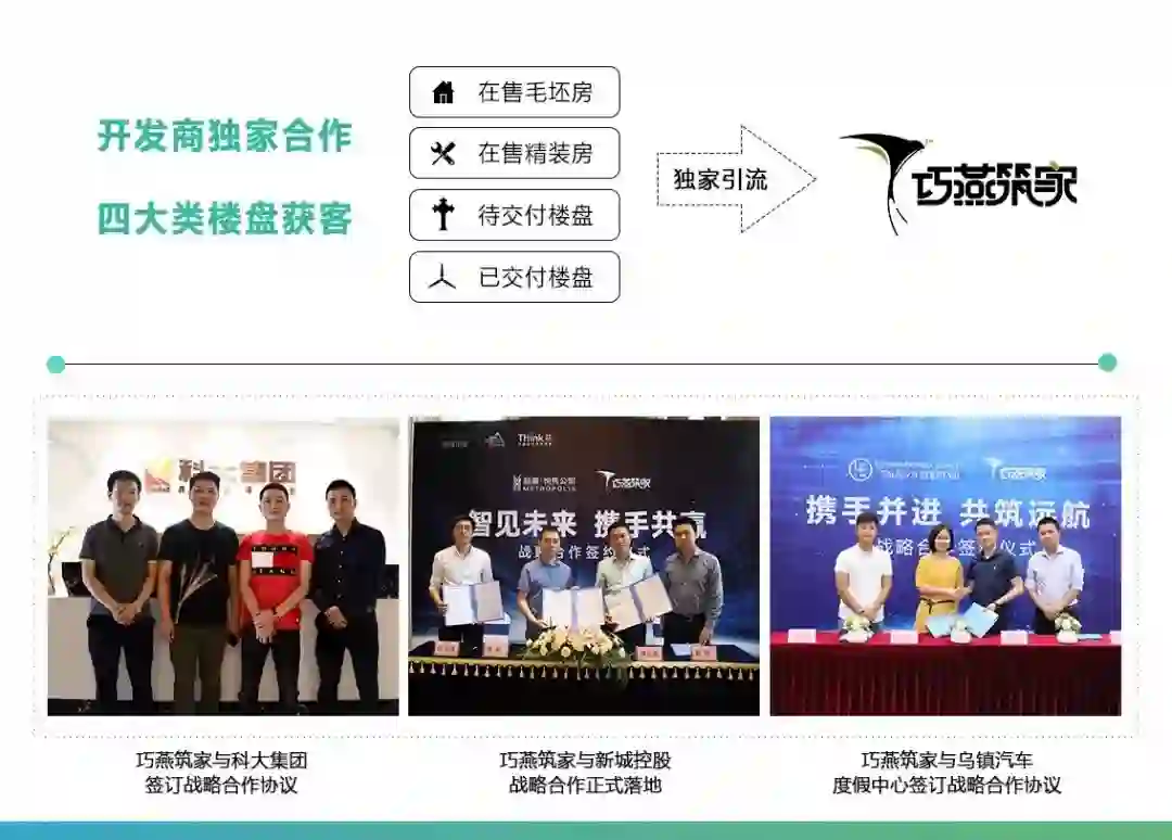 巧燕筑家已与多家TOP50级别品牌房企达成独家战略合作,与房地产楼盘无缝对接,为装企线下流量赋能