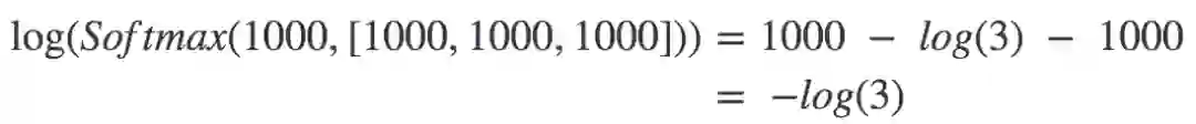 让我们举例演示这个问题,从xi中取样两个样本:{1000, 1000, 1000}和{-1000, -1000, -1000}。将这两个序列传入softmax函数会得到同一概率分布{1/3, 1/3, 1/3},然后1/3的对数是一个合理的负数。现在让我们尝试用Python算下求和中的一项: