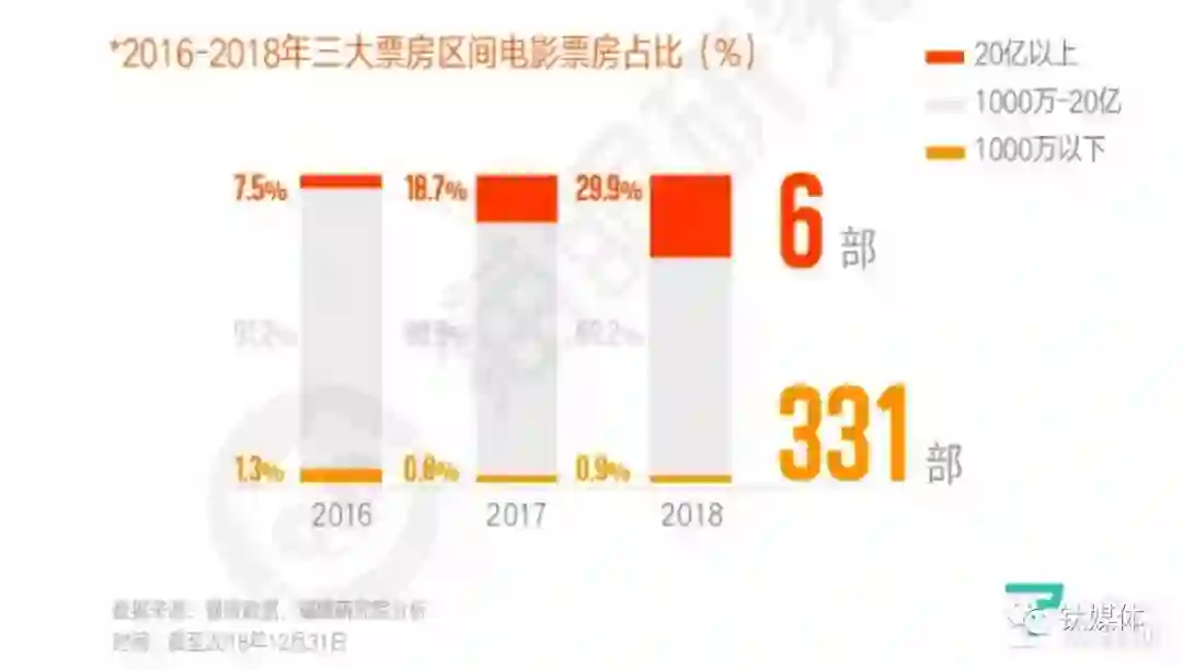 以收入最为透明的电影票房为例,根据猫眼研究院发布的《2018中国电影市场数据洞察》显示,2018年,20亿以上的6部电影贡献了整个市场的30%的票房,1000万以下的电影331部,仅贡献0.9%的票房,票房收入加速两极化趋势,头部效应的趋势持续增强。