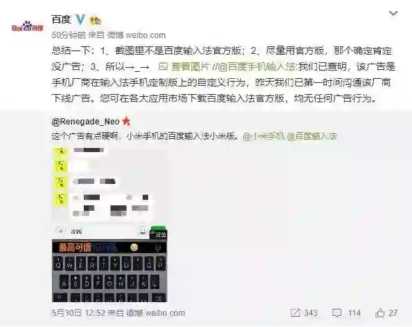 今日,针对微博网友质疑百度手机输入法根据用户输入推送相应广告的质疑,百度方面做出回应,称该广告是手机厂商在输入法手机定制版上的自定义行为,昨天百度方面已第一时间沟通相应厂商下线广告。