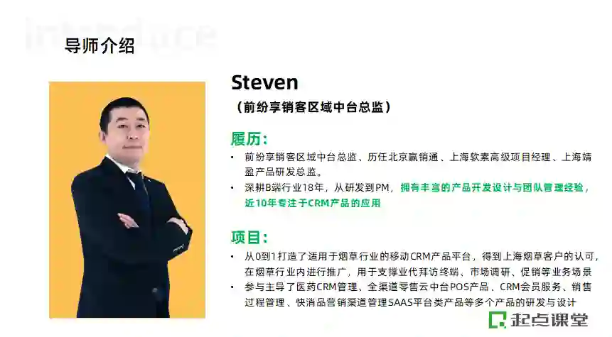 10月19日(周三)晚8点,人人都是产品经理&起点课堂特邀深耕B端行业18年、前纷享销客区域中台总监@Steven老师在线分享。