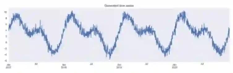 # 避免重复np.random.seed(42)# 生成日期的数据格式range_of_dates = pd.date_range(start="2017-01-01",End="2020-12-30")X = pd.DataFrame(index=range_of_dates)# 创建日期数据的序列X["day_nr"] = range(len(X))X["day_of_year"] = X.index.day_of_year# 生成目标成分signal_1 = 3 + 4 * np.sin(X["day_nr"] / 365 * 2 * np.pi)signal_2 = 3 * np.sin(X["day_nr"] / 365 * 4 * np.pi + 365/2)noise = np.random.normal(0, 0.85, len(X))# 合并获取目标序列y = signal_1 + signal_2 + noise# 画图y.plot(figsize=(16,4), title="Generated time series");