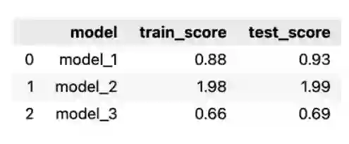 score_list = []for fit_col in ["model_1", "model_2", "model_3"]:scores = {"model": fit_col,"train_score": mean_absolute_error(results_df.iloc[:TRAIN_END]["actuals"],results_df.iloc[:TRAIN_END][fit_col]),"test_score": mean_absolute_error(results_df.iloc[TRAIN_END:]["actuals"],results_df.iloc[TRAIN_END:][fit_col])}score_list.append(scores)scores_df = pd.DataFrame(score_list)scores_df