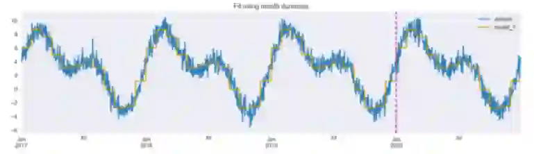 图 2:使用月份假人进行拟合。垂直线将训练集和测试集分开。