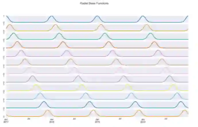 最后一种方法使用径向基函数。我们不会详细介绍它们的实际情况,但您可以在此处阅读有关该主题的更多信息。从本质上讲,我们再次希望解决第一种方法遇到的问题,即我们的时间特征具有连续性。