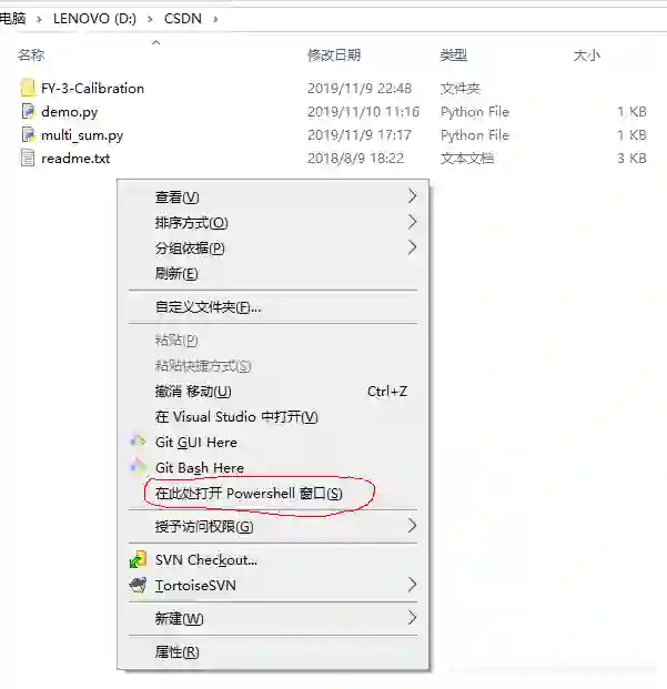 第1步,打开一个命令行窗口,路径切换到脚本所在的文件夹。我习惯在脚本所在窗口的空白位置(确保没有选中任何对象),按下shift键点击鼠标右键,在弹出的菜单中选择打开Powershell窗口。如下图所示。
