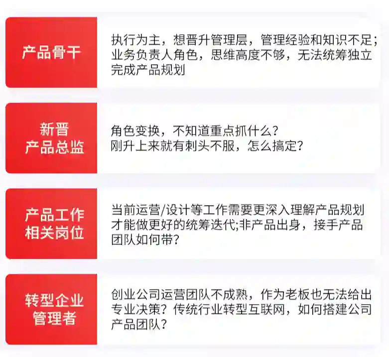 如果你已经有3年以上的工作经验: 具备扎实的业务技能,希望能通过系统的学习、与圈内大牛的交流,成为能做全盘战略规划,带团队,对业务有把控力的产品管理者!这门课必须推荐给你!
