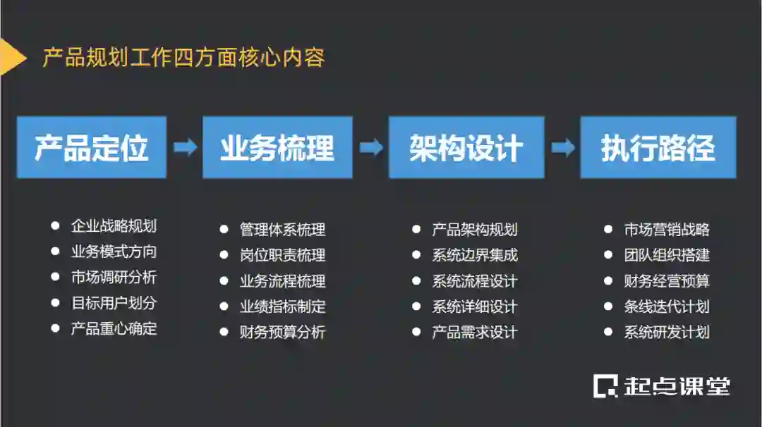 具体可拆分为以下4个环节:产品定位➝业务梳理➝架构设计➝执行路径。