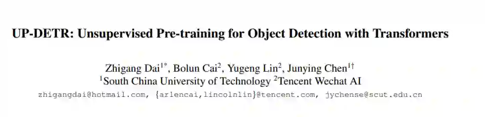 通过一个Transformer编码器-解码器架构的目标检测transformers (DETR)取得了与Faster R-CNN相匹配的性能。受预训练transformer在自然语言处理中取得的巨大成功的启发,我们提出了一种基于随机查询补丁检测的无监督预训练目标检测任务。具体地说,我们从给定的图像中随机裁剪小块,然后将它们作为查询输入解码器。该模型经过预训练,从原始图像中检测出这些查询补丁。在预训练,我们解决了两个关键问题:多任务学习和多查询定位。(1)为了权衡在前置任务中分类和定位的多任务学习,我们冻结CNN骨干,提出一个与patch检测联合优化的patch特征重构分支。(2)为实现多查询定位,我们引入了单查询补丁的UP-DETR ,并将其扩展为具有对象查询洗牌和注意掩码的多查询补丁。在我们的实验中,UP-DETR算法在PASCAL VOC和COCO数据集上具有更快的收敛速度和更高的精度,显著提高了DETR算法的性能。代码很快就会发布。