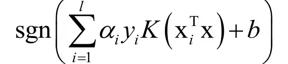 在上图中两条直线都可以将两类样本分开。问题是:在多个可行的线性分类器中,什么样的分类器是好的?为了得到好的泛化性能,分类平面应该不偏向于任何一类,并且离两个类的样本都尽可能的远。这种最大化分类间隔的目标就是支持向量机的基本思想。支持向量机在训练时优化的目标是让训练样本尽量分类正确,而且决策面离两类样本尽可能远。原问题带有太多的不等式约束,一般转化为对偶问题求解,使用拉格朗日对偶,加上核函数之后,优化的对偶问题为: