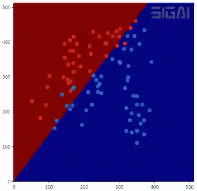 从上图可以看到,分界面是一条直线,这也说明了它是一个线性模型。
